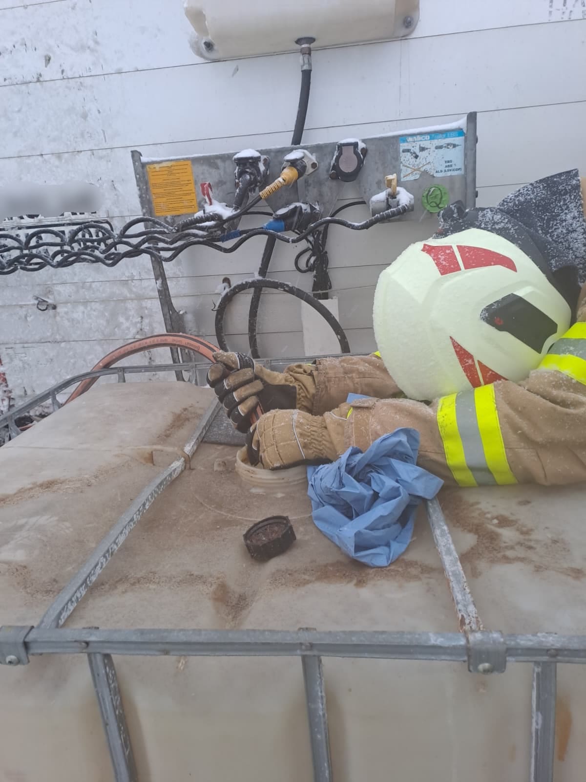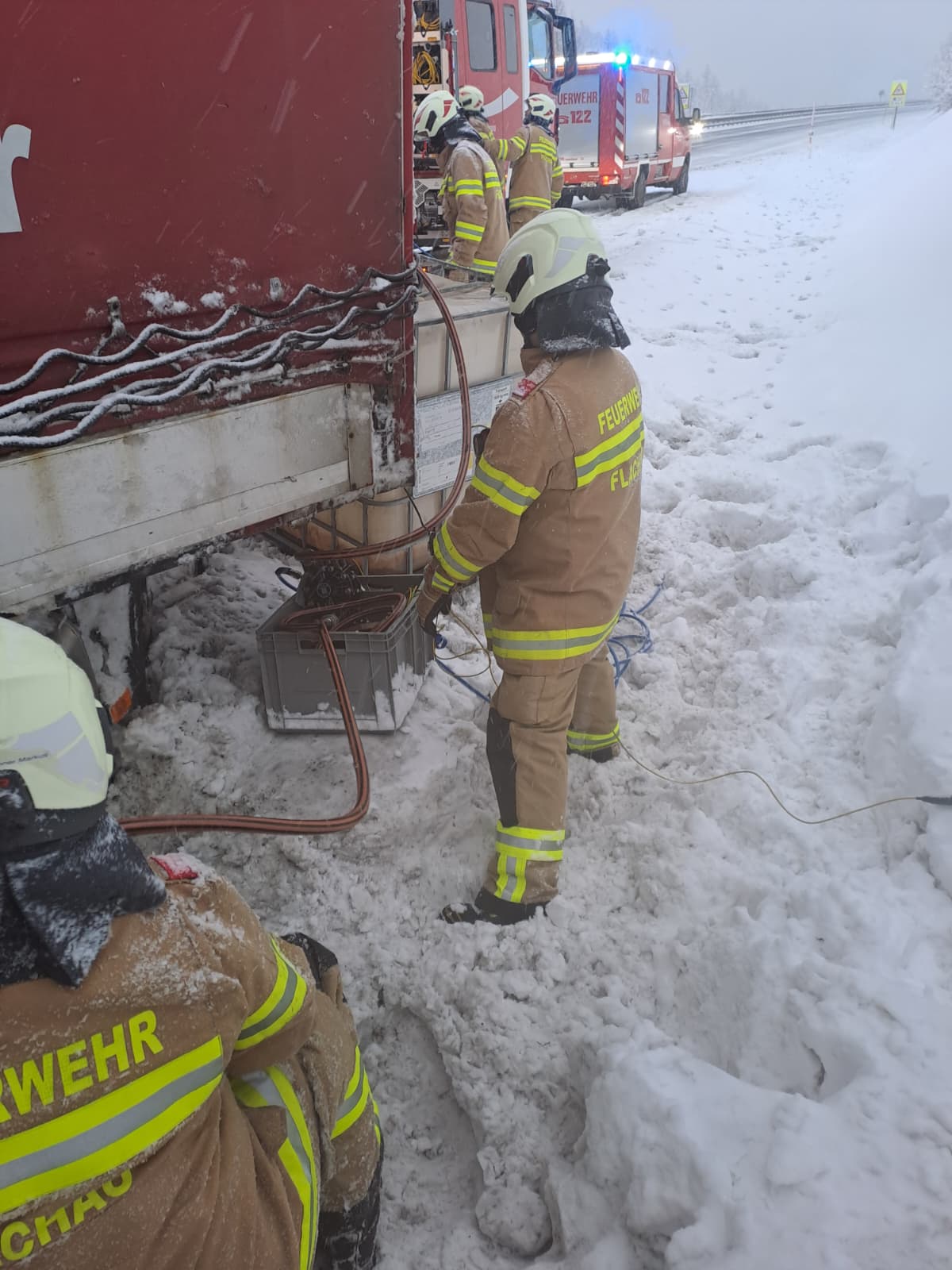 Die Einsatzstelle wurde umgehend abgesichert und ein Brandschutz aufgebaut. Schwerpunkt der Arbeiten war das Eindämmen des Dieselaustritts sowie der Schutz der Umwelt. Der beschädigte Tank wurde gesichert und der verbleibende Kraftstoff gemeinsam mit dem privaten Bergeunternehmen Höller umgepumpt, um ein weiteres Ausfließen zu verhindern. Verunreinigter Schnee und Erdreich wurden entsprechend gebunden bzw. gesichert.