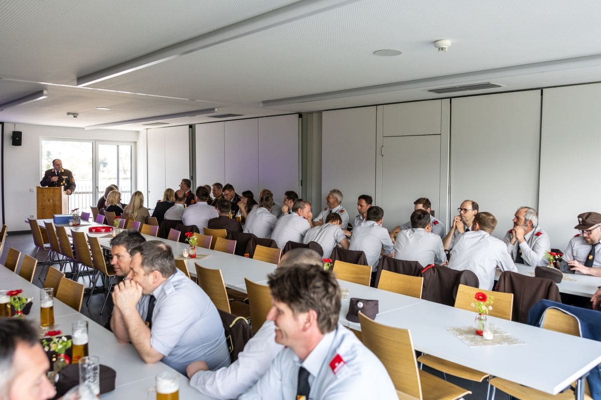 Nach den Ehrungen marschierten die Kameradinnen und Kameraden unter Begleitung der FF-Musik zurück zum Dorfplatz. Anschließend fand die Jahreshauptversammlung in der Einsatzzentrale (Saal, 2. Obergeschoss) statt. Vor Beginn wurde vor der Ausfahrt der Einsatzzentrale ein neues Mannschaftsfoto aufgenommen.