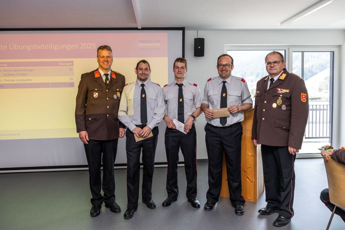 Im Zuge der Jahreshauptversammlung wurden zudem verdiente Führungskräfte geehrt: Die ehemaligen Kommandanten aus der Periode von OFK Lackner – HBI Werner Kaswurm, OBI Hannes Lackner sowie BR Christian Lackner – wurden zu Ehrenkommandanten der Feuerwehr Flachau ernannt.
